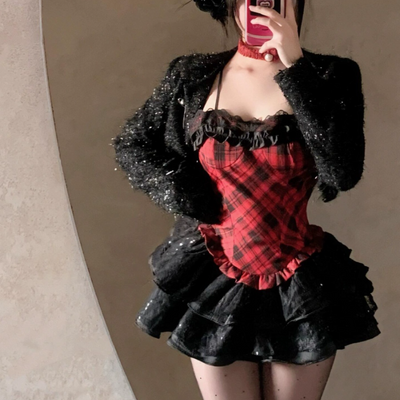 Plaid ruffle long sleeve cami 2 piece mini dress