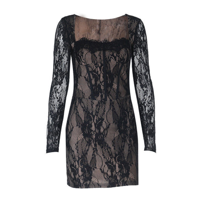 Long sleeve lace deep v neck see through mini dress