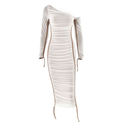 Long sleeve one shoulder ruched stitch mesh midi dress-final-sale