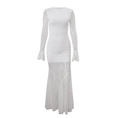 Long sleeve lace crewneck hollow out cut out maxi dress