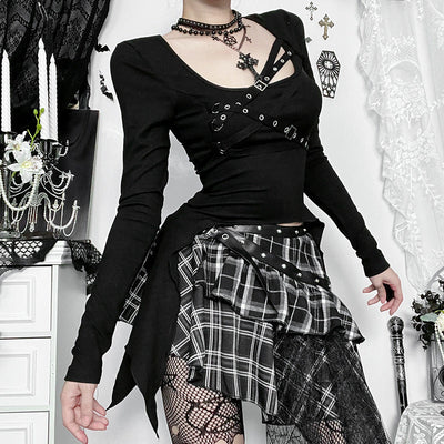 One shoulder long sleeve buckle cross pattern top