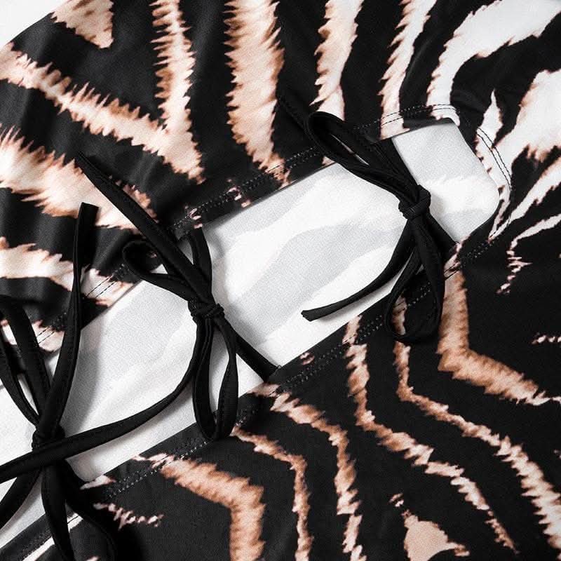 Backless self tie long sleeve tiger print contrast midi dress-final-sale