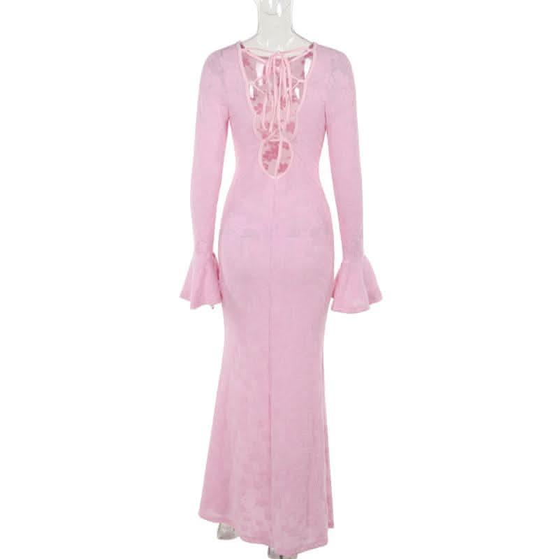 Crewneck long sleeve lace up flower pattern maxi dress-final-sale