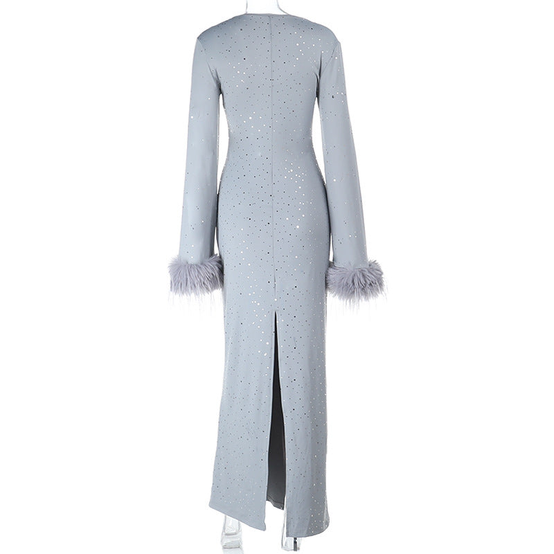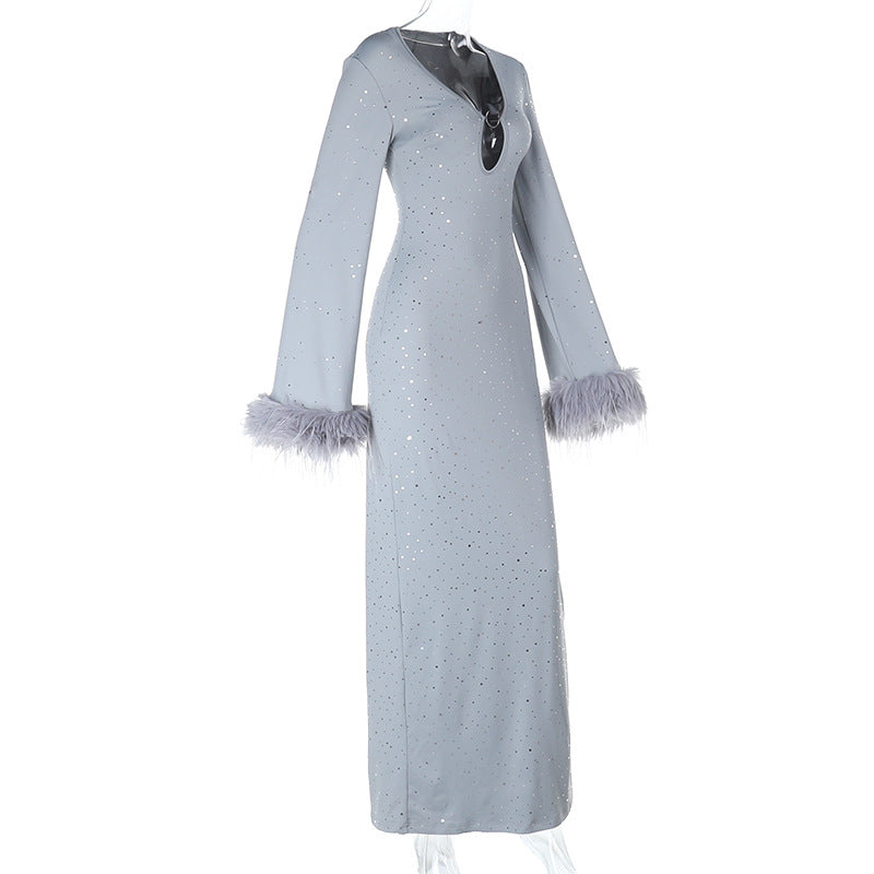 Hollow out slit long sleeve fluffy glitter cut out maxi dress