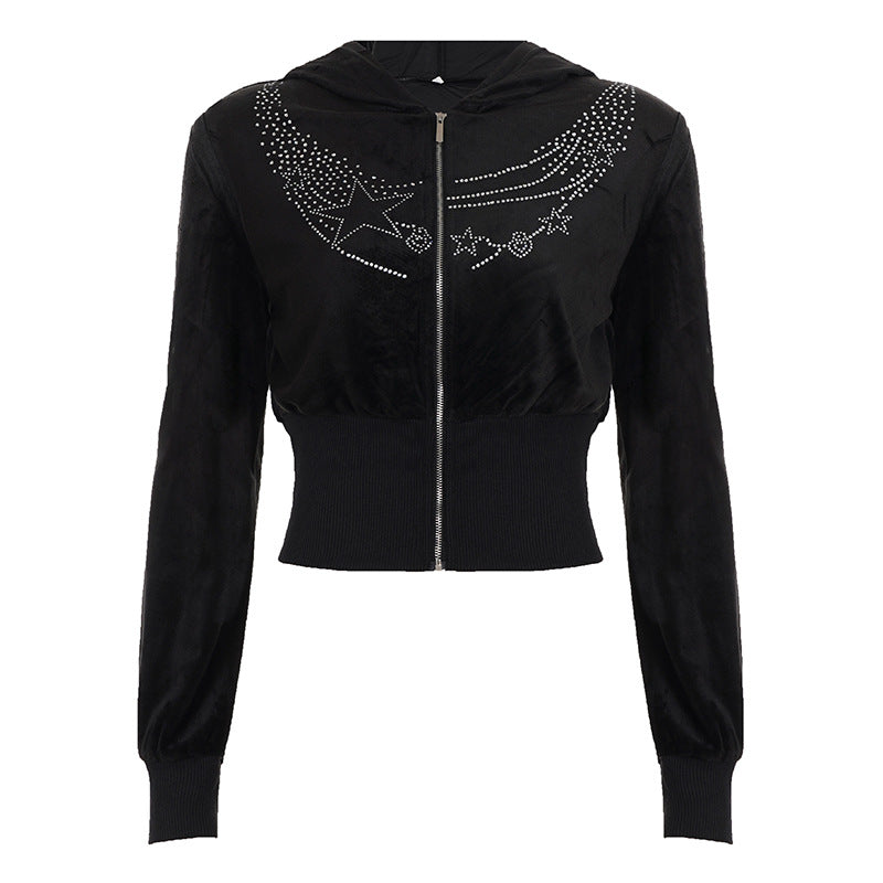 Hoodie long sleeve zip-up velvet beaded top