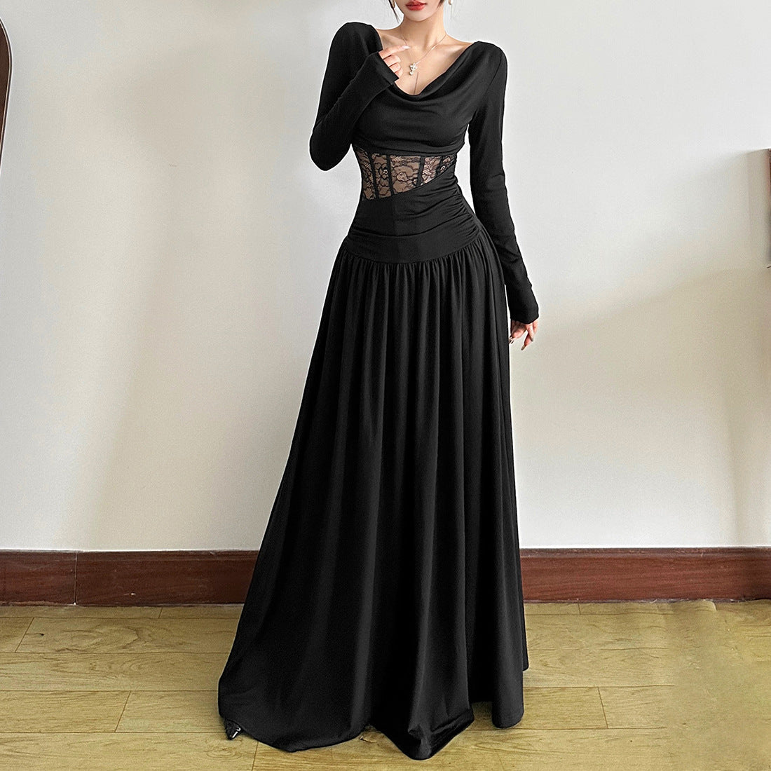 Long sleeve cowl neck lace ruched maxi dress