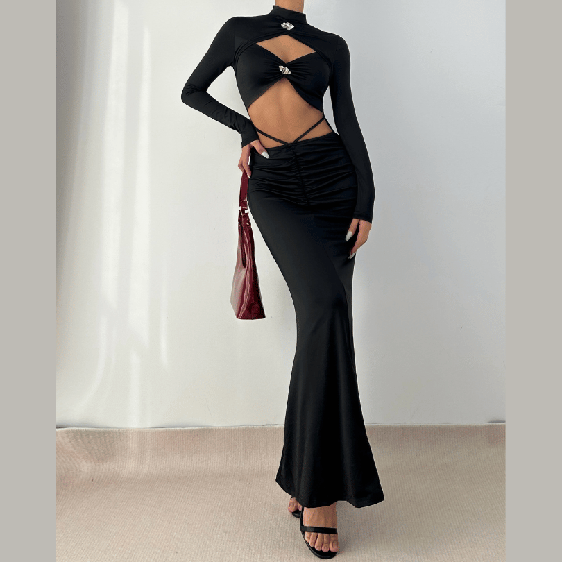 Long sleeve high neck hollow out cut out maxi dress