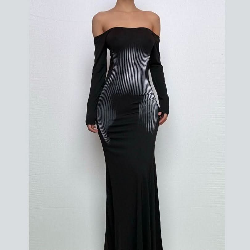 Long sleeve off shoulder print contrast maxi dress-final-sale