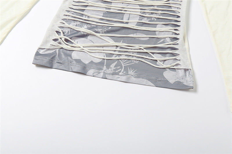 Long sleeve print hollow out contrast cut out top