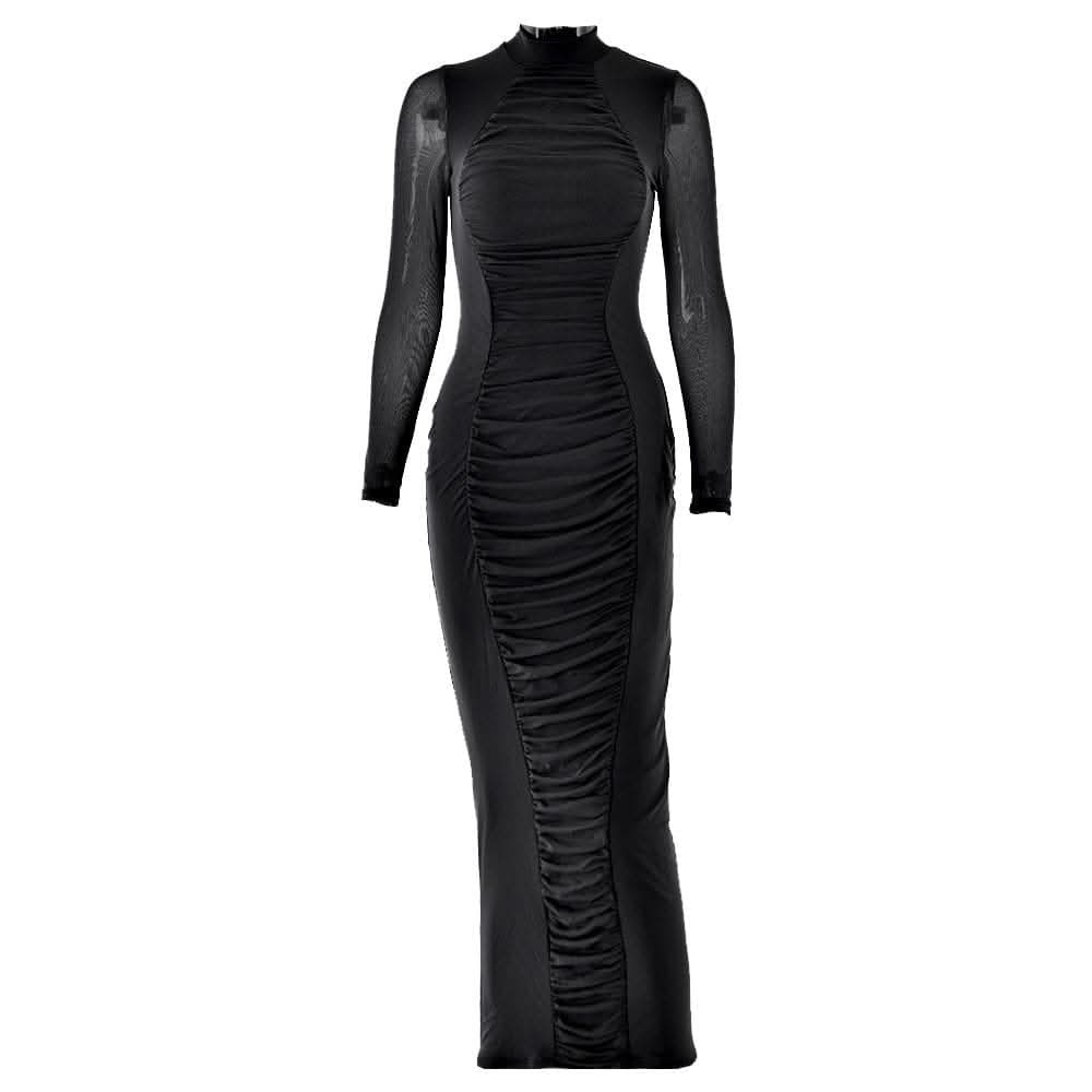 Long sleeve ruched mesh patchwork maxi dress-final-sale