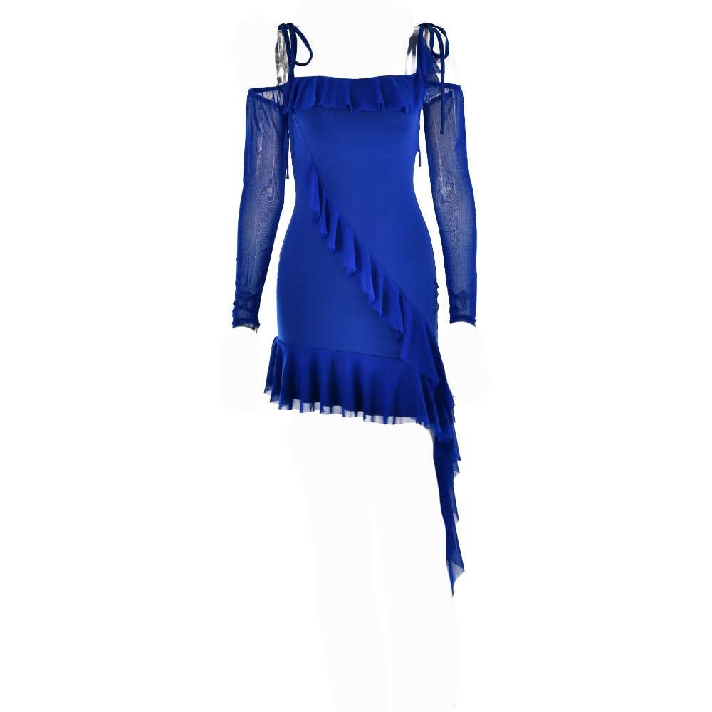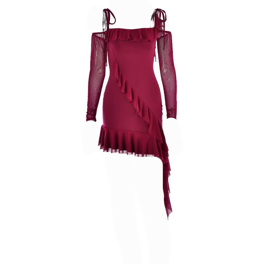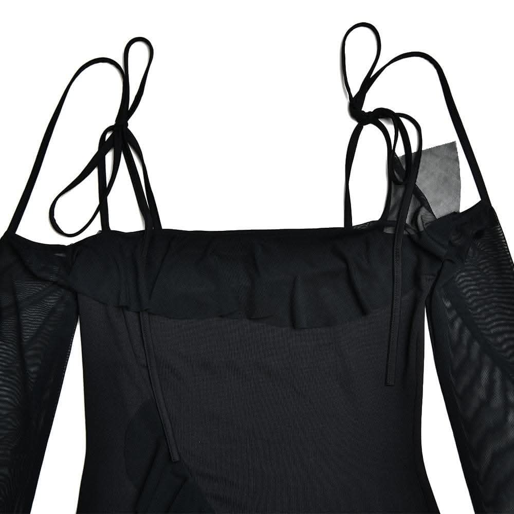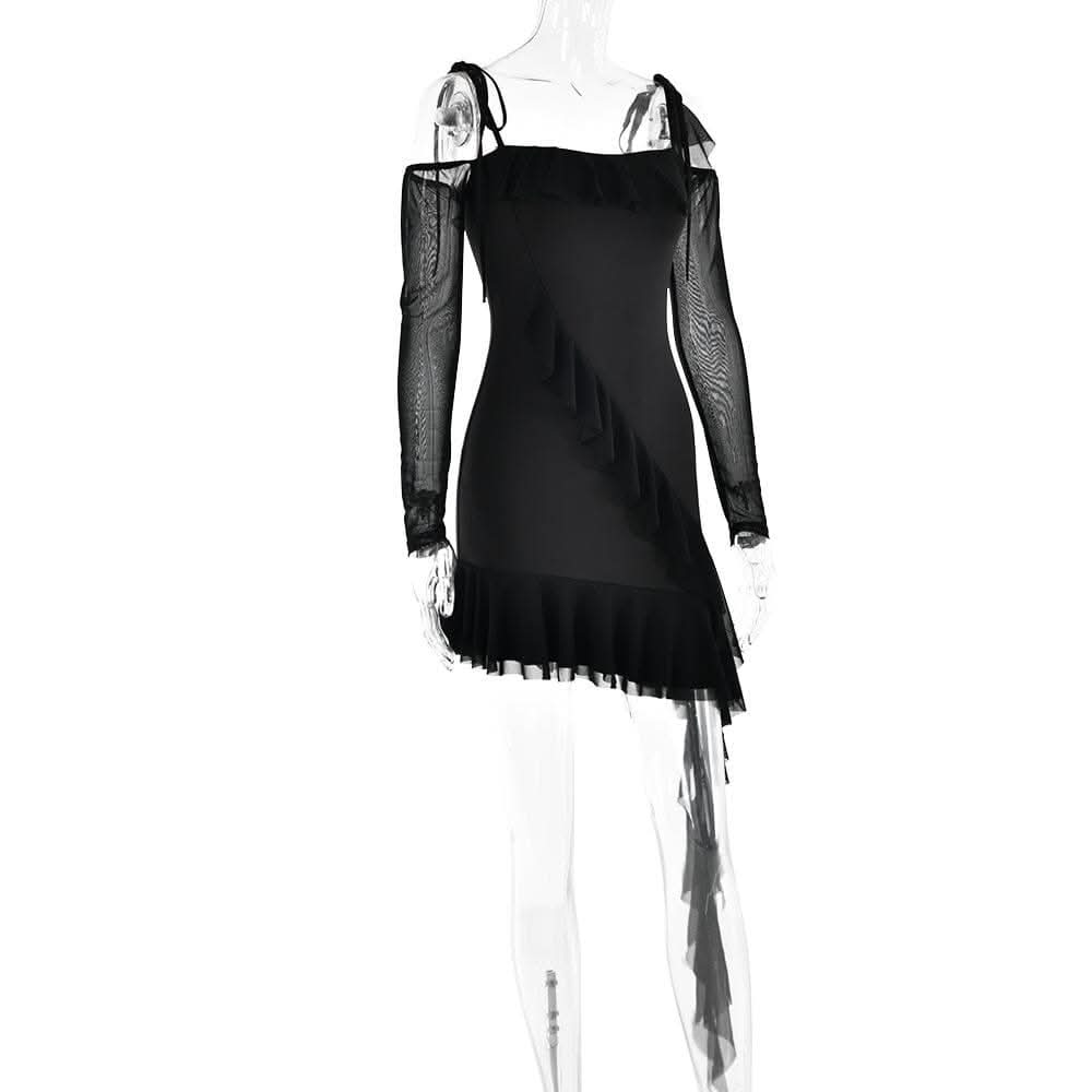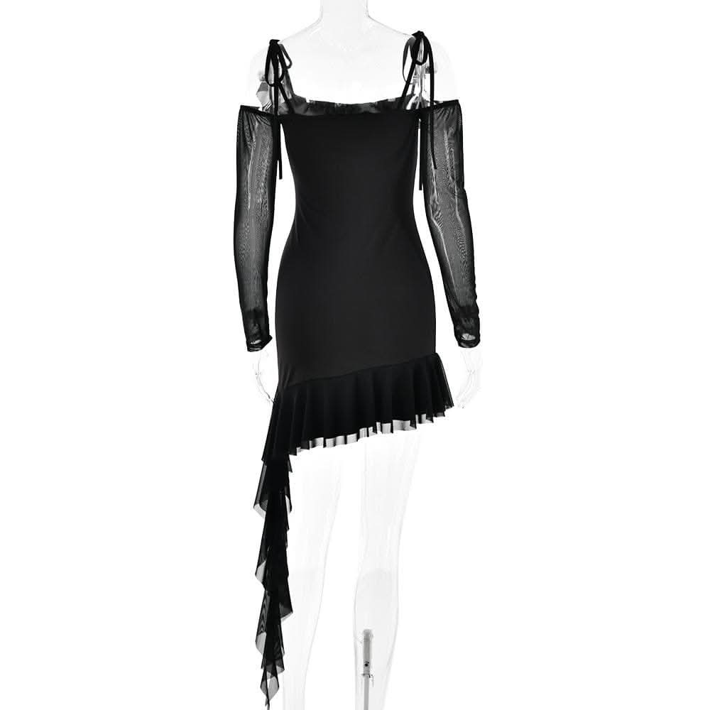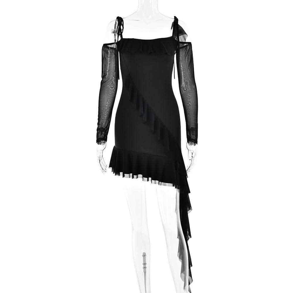 Ruffle self tie irregular off shoulder mesh long sleeve mini dress-final-sale