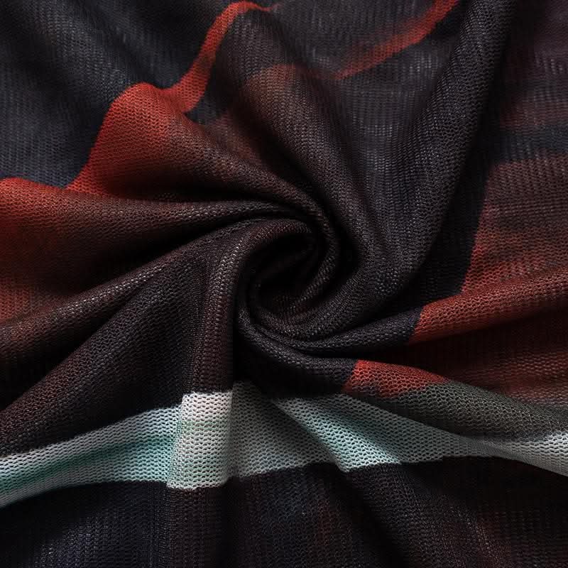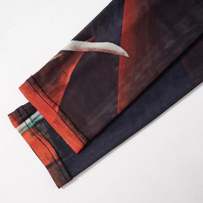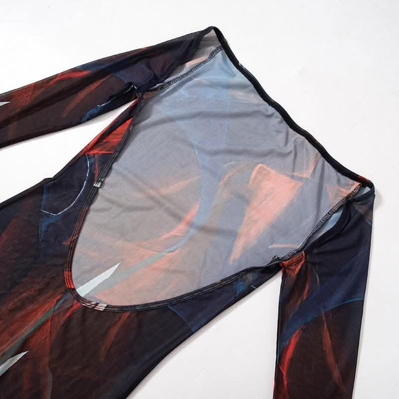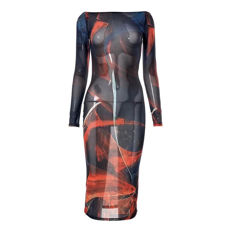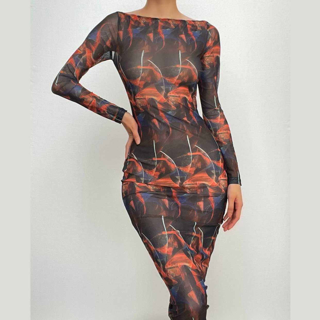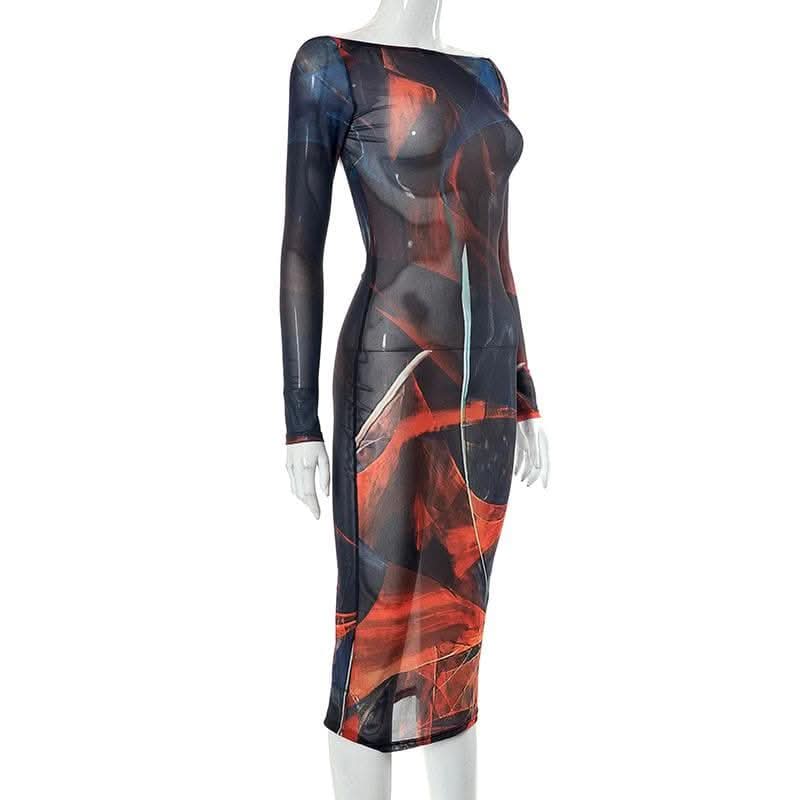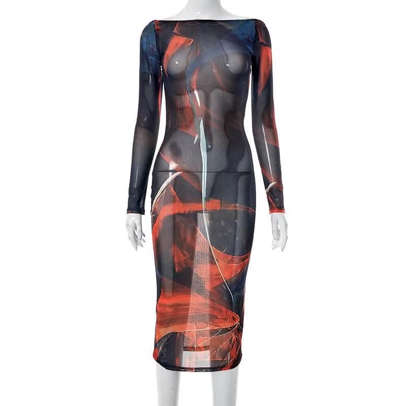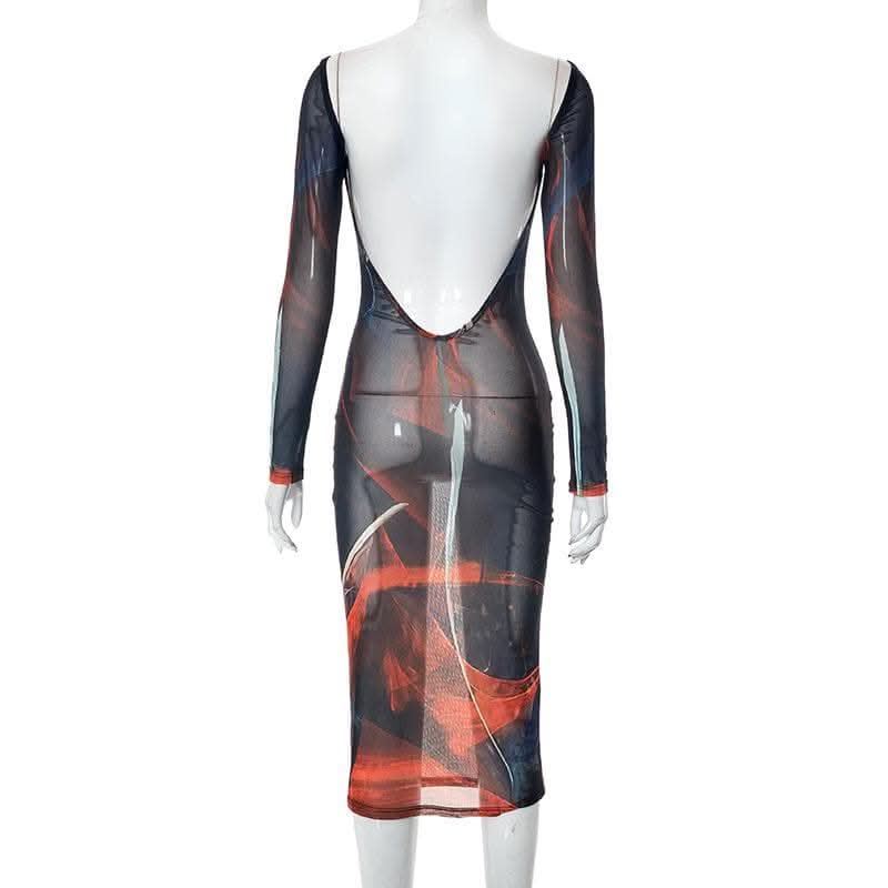 Sheer mesh see through backless contrast print long sleeve midi dress-final-sale