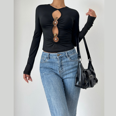 Long sleeve hollow out ruched crewneck cut out top
