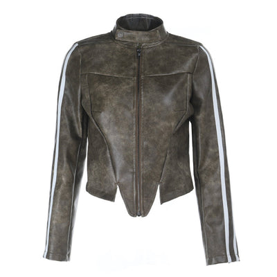 Zip-up long sleeve turnover collar PU leather top