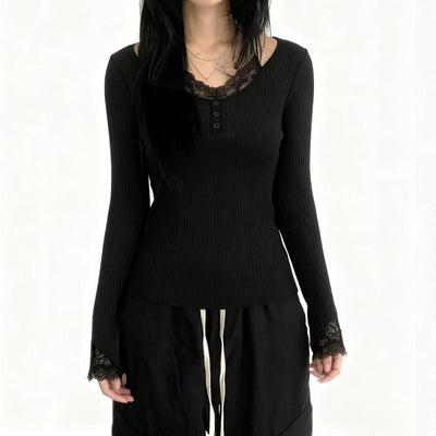 Button ruffle long sleeve lace hem textured solid 2 piece top