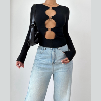 Long sleeve off shoulder bowknot hollow out ribbed cut out top-final-sale