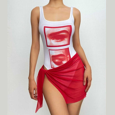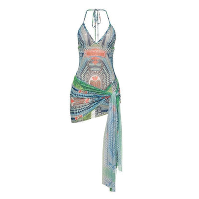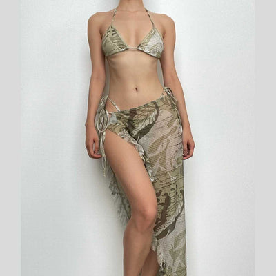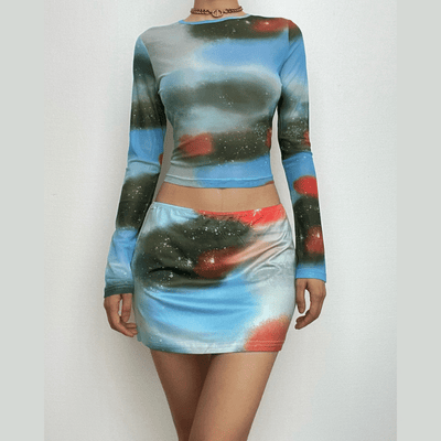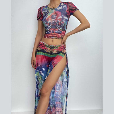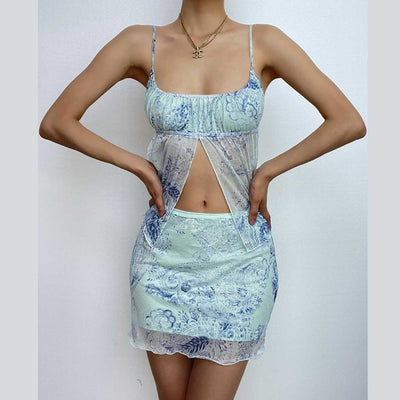 Cowl neck lace up tie dye slit mesh cami midi skirt set