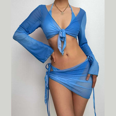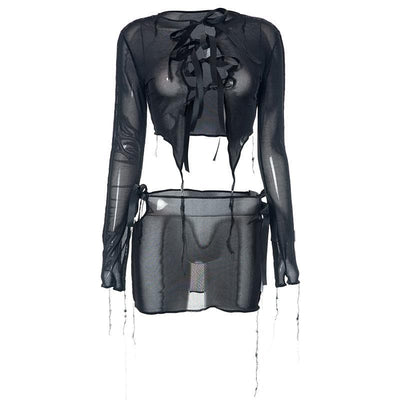 Knotted mesh solid long sleeve lace patchwork self tie mini skirt set