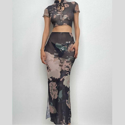 Sheer mesh see through long sleeve stitch contrast maxi skirt set-final-sale