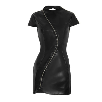 Crewneck PU leather zip-up short sleeve mini dress