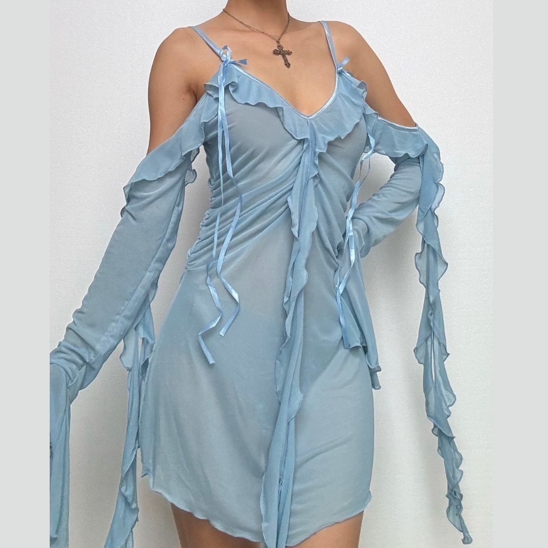 Long flared sleeve Off shoulder sheer mesh ruffle mini dress | Festival Outfits Women