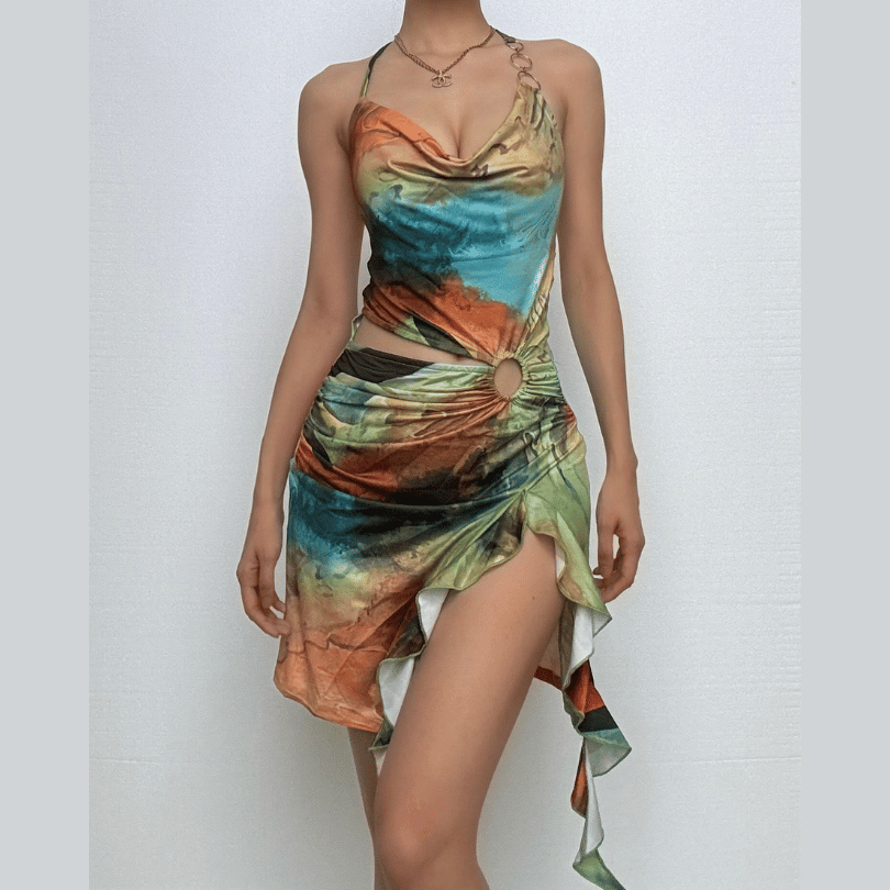 Halter print cowl neck o ring ruffle mini dress | Festival Outfits Women