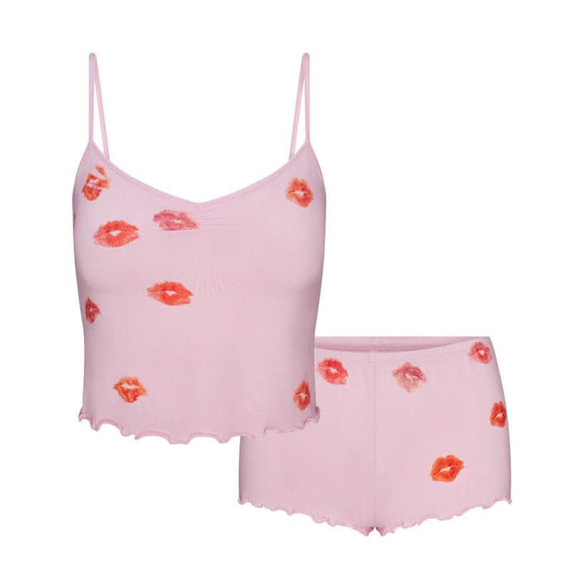 U neck lips print ruffle cami short pant set | Festival Outfits Women