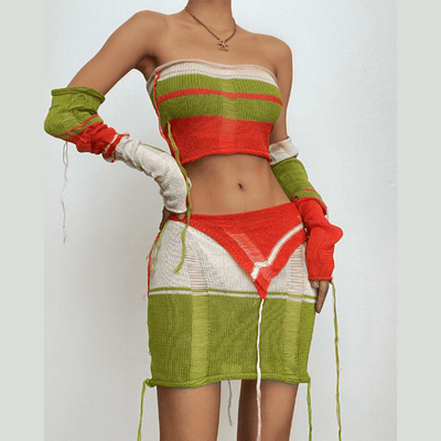 Irregular turnover collar short sleeve striped knitted mini skirt set