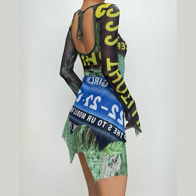 Contrast backless long sleeve crewneck mini dress
