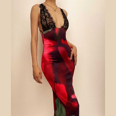 Lace up halter flower pattern irregular ruffle contrast maxi dress