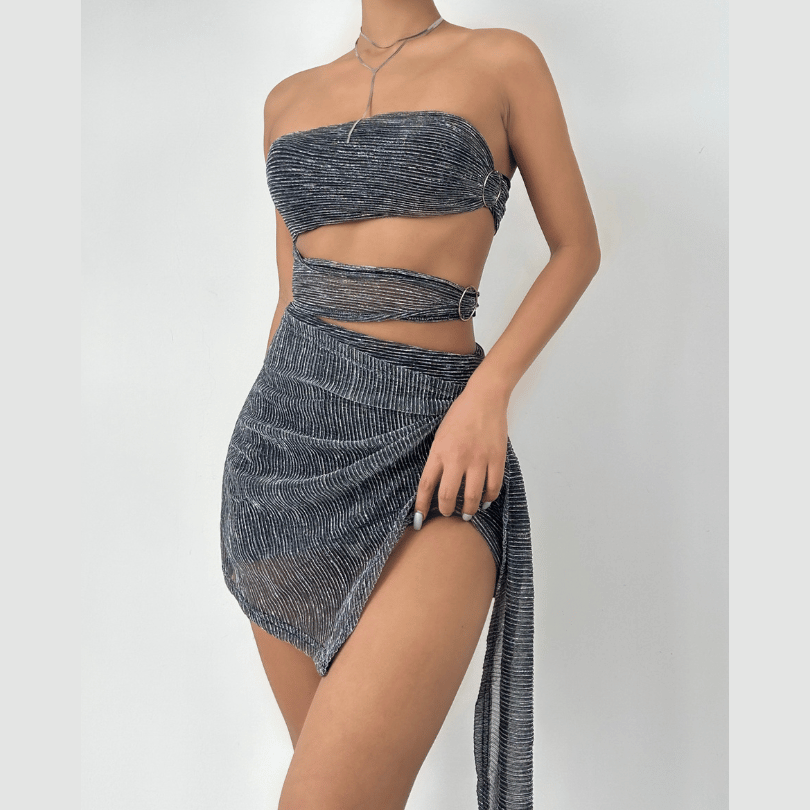 O ring hollow out irregular ruffle ribbed ruched tube cut out mini dress