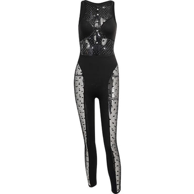 Long sleeve hollow out gloves solid zip-up jumpsuit