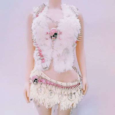 Fluffy rivet halter skull applique self tie mini skirt set