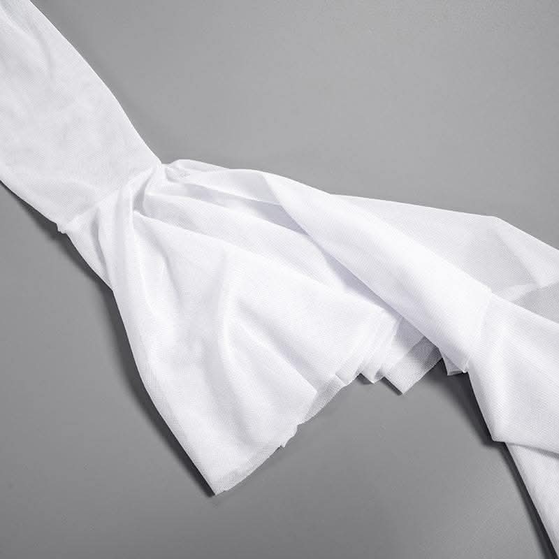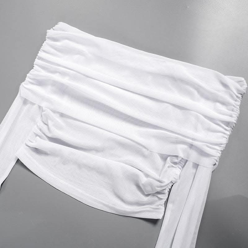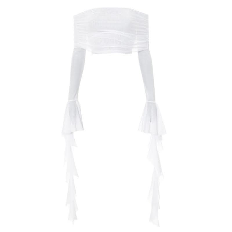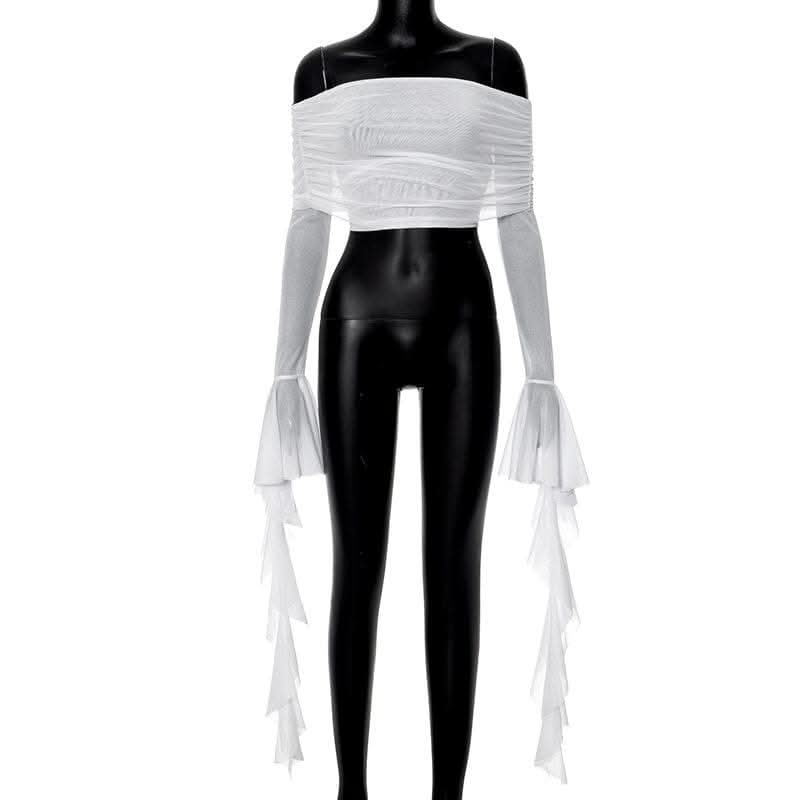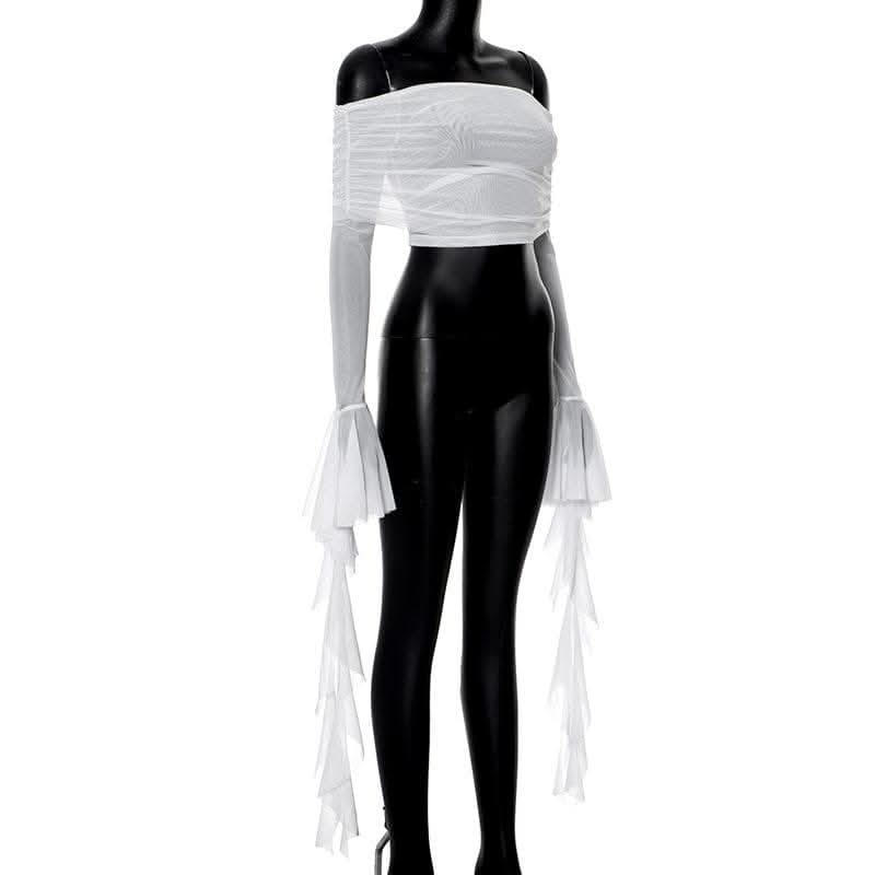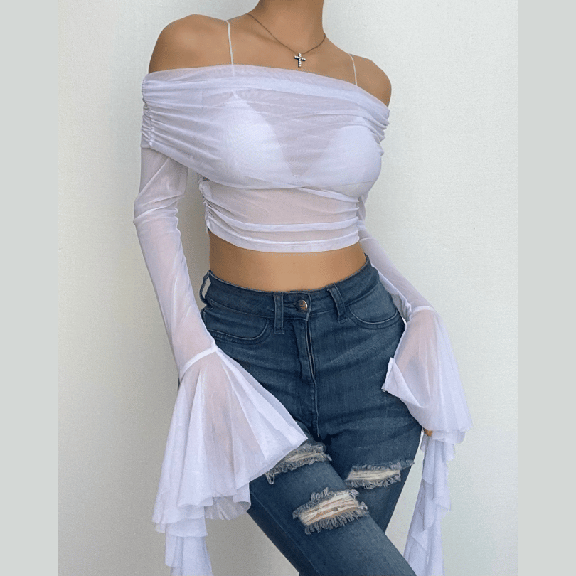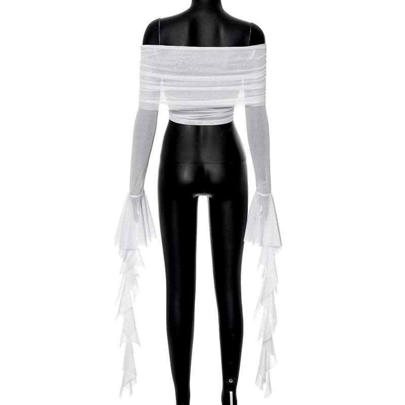 Long flared sleeve off shoulder ruffle sheer mesh backless top-final-sale