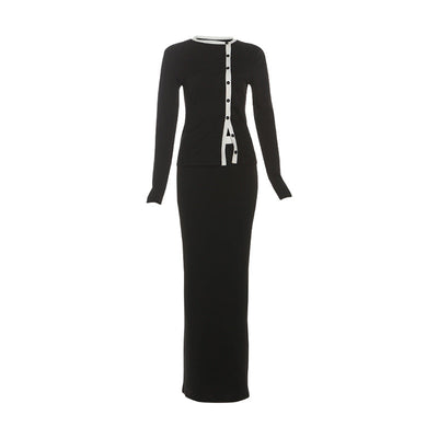 Long sleeve crewneck gloves hollow out solid maxi skirt set