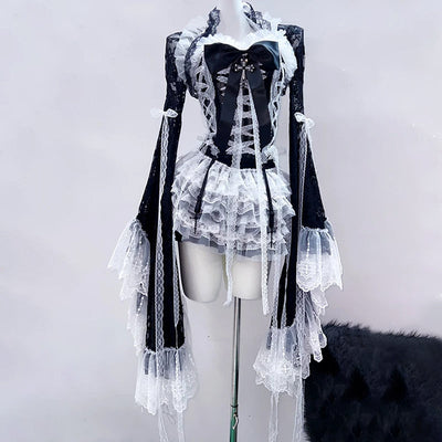 Knotted mesh solid long sleeve lace patchwork self tie mini skirt set