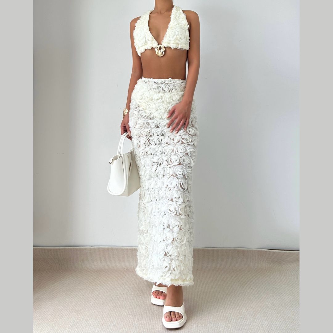 Halter v neck flower pattern 3 piece maxi skirt set | Festival Outfits Women