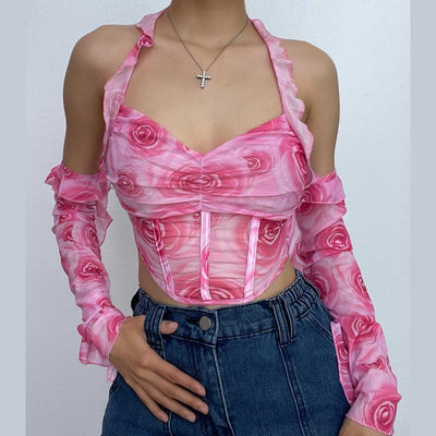 Halter rose applique sheer mesh ruffle v neck backless crop top