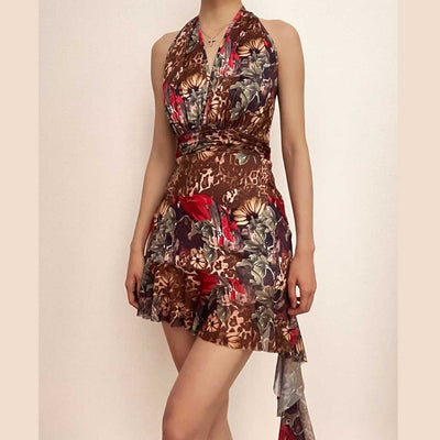 Sheer mesh plaid contrast print halter ruffle backless mini dress