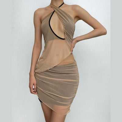 Cross front gloves hollow out halter mesh bodysuit maxi skirt set