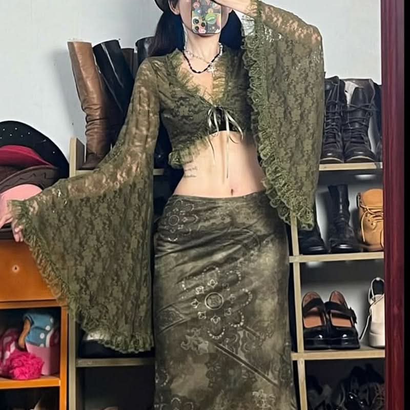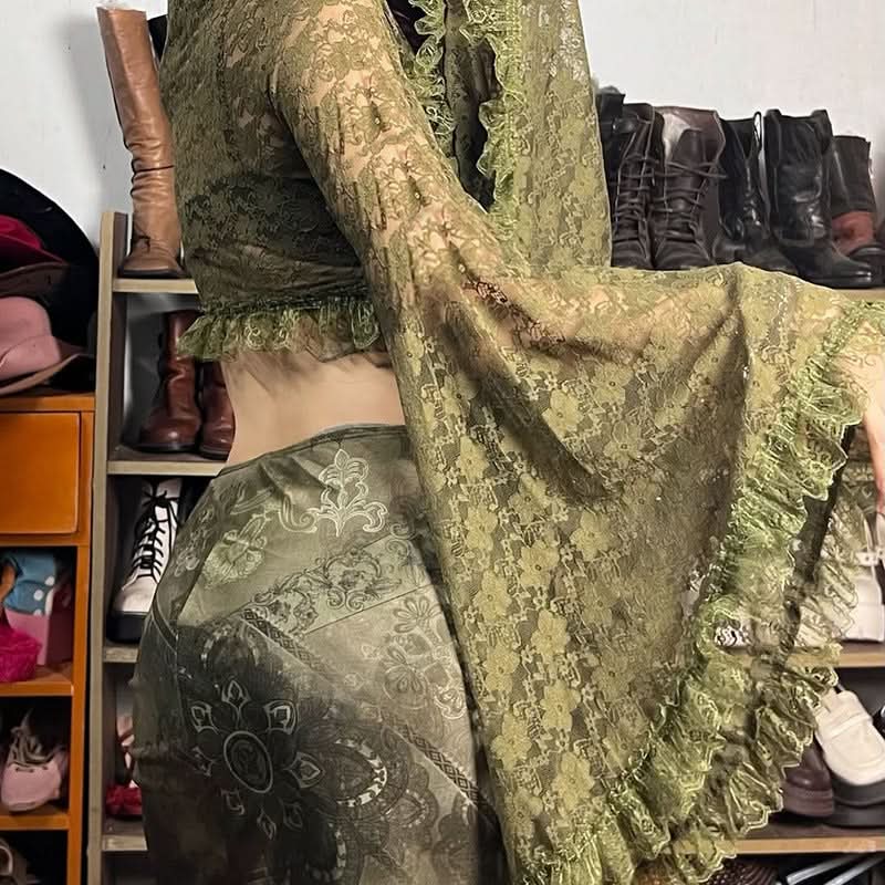 Long flared sleeve lace ruffle self tie v neck crop top