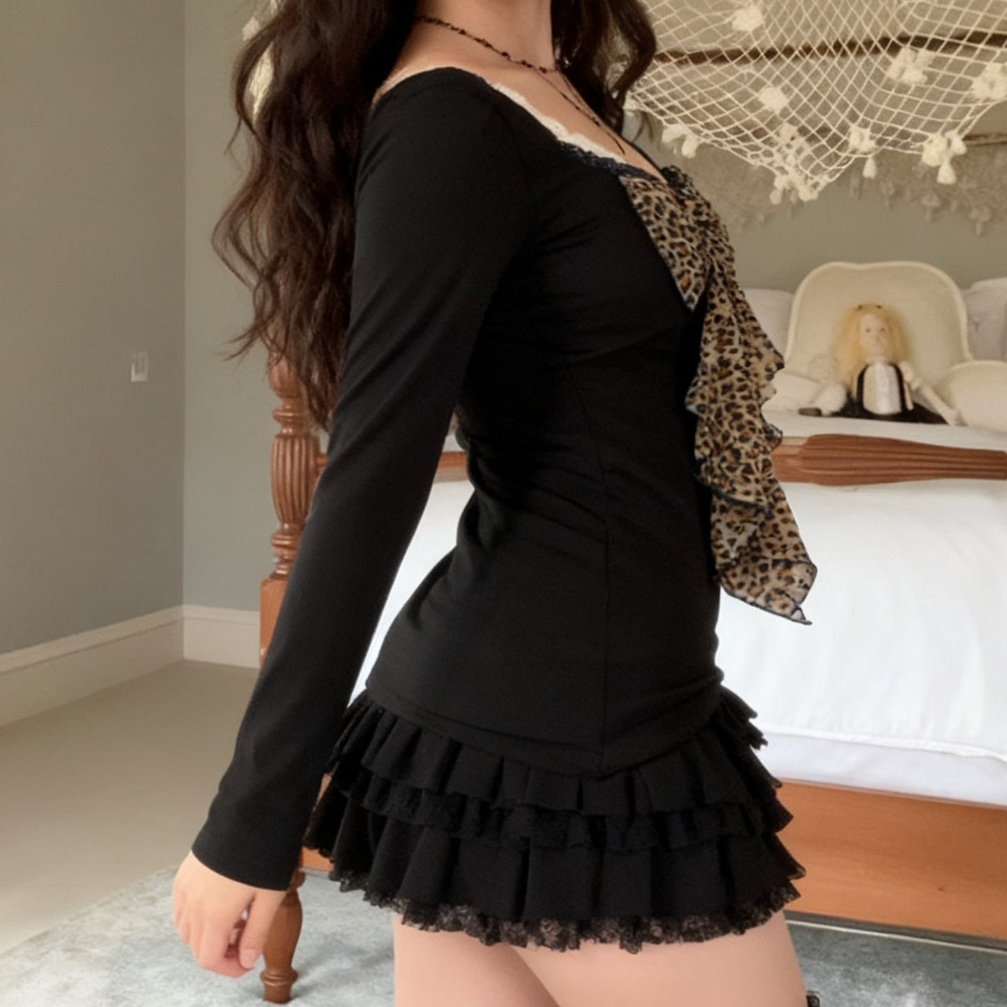 Long sleeve bowknot leopard print v neck top