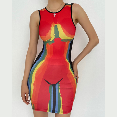 Sleeveless crewneck body print sheer mesh maxi dress