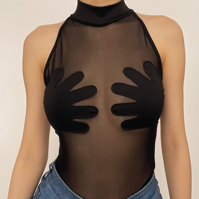 Sheer mesh see through palm embroidered crewneck crop top