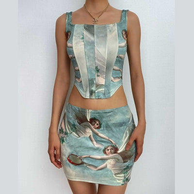 Corset lace patchwork tube ruffle low rise mini skirt set