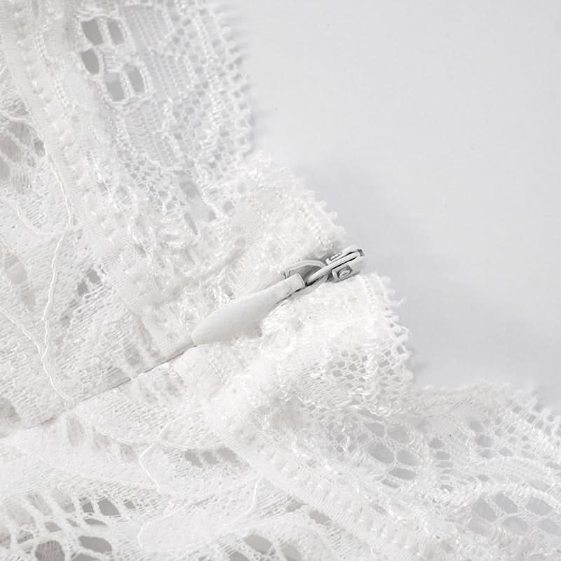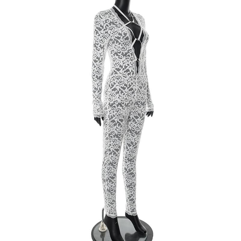 Hollow out o ring lace long sleeve self tie jumpsuit