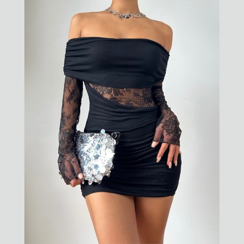 Off shoulder long sleeve lace ruched mini dress
