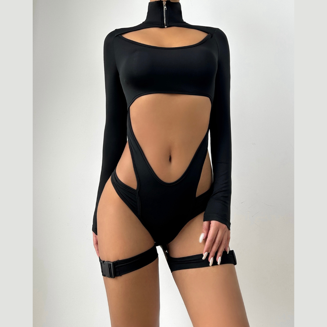 Hollow out zip-up long sleeve button buckle bodysuit