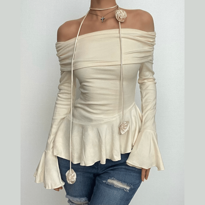 Off shoulder ruffle flower applique long flared sleeve ruched top | Festival Outfits Women