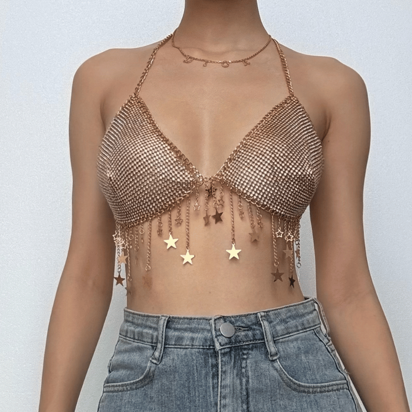 Metal chain star decor halter backless bralette top | Festival Outfits Women